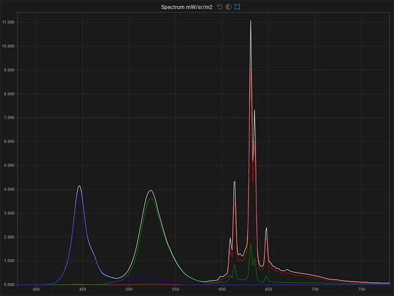 Notice the spiky spectral response and narrow peaks, a high-end spectrometer is needed to measure this panel accurately.