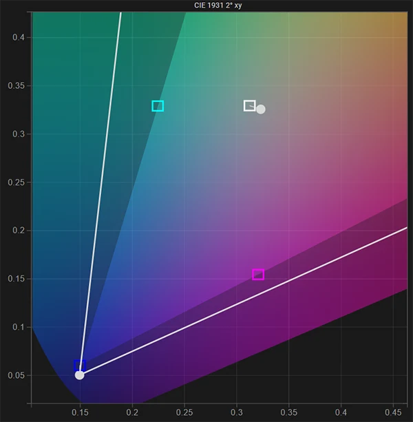 Gamut (post calibration) compared to the Rec 709 D65 target - both color space and white point are on target.
