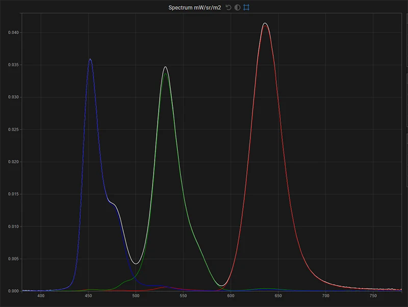 This is the spectrum of the FSI XMP310 in native gamut for full white, with the red, green and blue primaries spectral output overlaid to identify color channel issues. The R, G, B color channels closely match the white response, this is ideal and one of the key advantages in HDR of QD-OLED over WOLED.