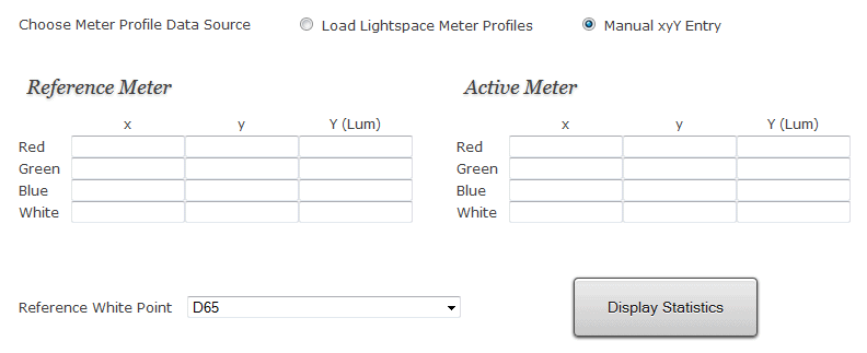 This tool allows you to compare an active meter profile against a reference meter profile. The comparison overview includes xyY, XYZ, Yuv stats as well as luminance difference and delta E results in dE 1976 Luv, dE 1976 Lab, dE 1994 and dE 2000.